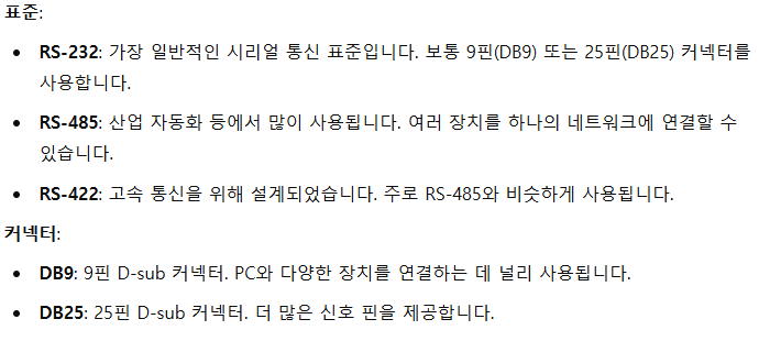 Serial기기 ↔ 시리얼 케이블 ↔ 물리적 시리얼 포트 ↔ PC