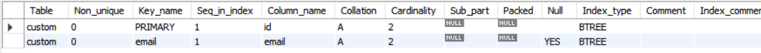 SHOW INDEXES FROM Custom;