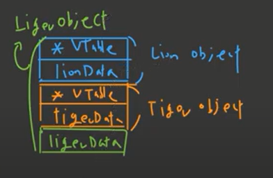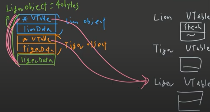 이 때 Lion, Tiger객체의 포인터는 모두 Liger 가상테이블을 가리킨다.