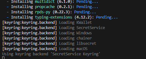 keyting은 시스템의 보안 저장소를 사용하여 비밀번호와 같은 민감한 정보를 안전하게 저장하는 라이브러리이다. 폐쇄적인 네트워크 환경이나 특정 시스템 설정에서는 keyring이 예상대로 작동하지 않을 수 있다고 해서, 아마 그게 문제가 아니였나 싶다.