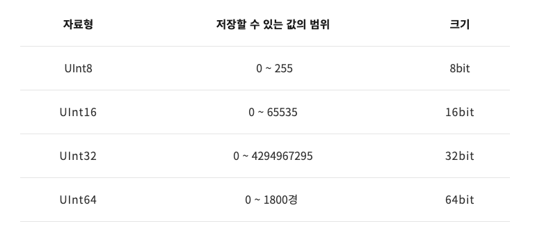 UInt는 Int와 다르게 양수만 저장할 수 있는 타입입니다. 부호 비트를 사용하지 않습니다.