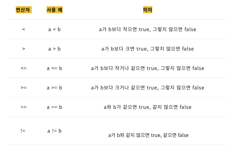 - 비교 연산자는 연산 결과가 항상 true 또는 false 입니다.