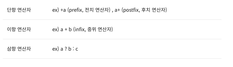 - 연산자는 연산을 수행하는 기호입니다. 연산자에 의해 연산 되는 값의 수(피연산자의 수)에 따라 단항, 이항, 삼항 연산자로 구분됩니다.