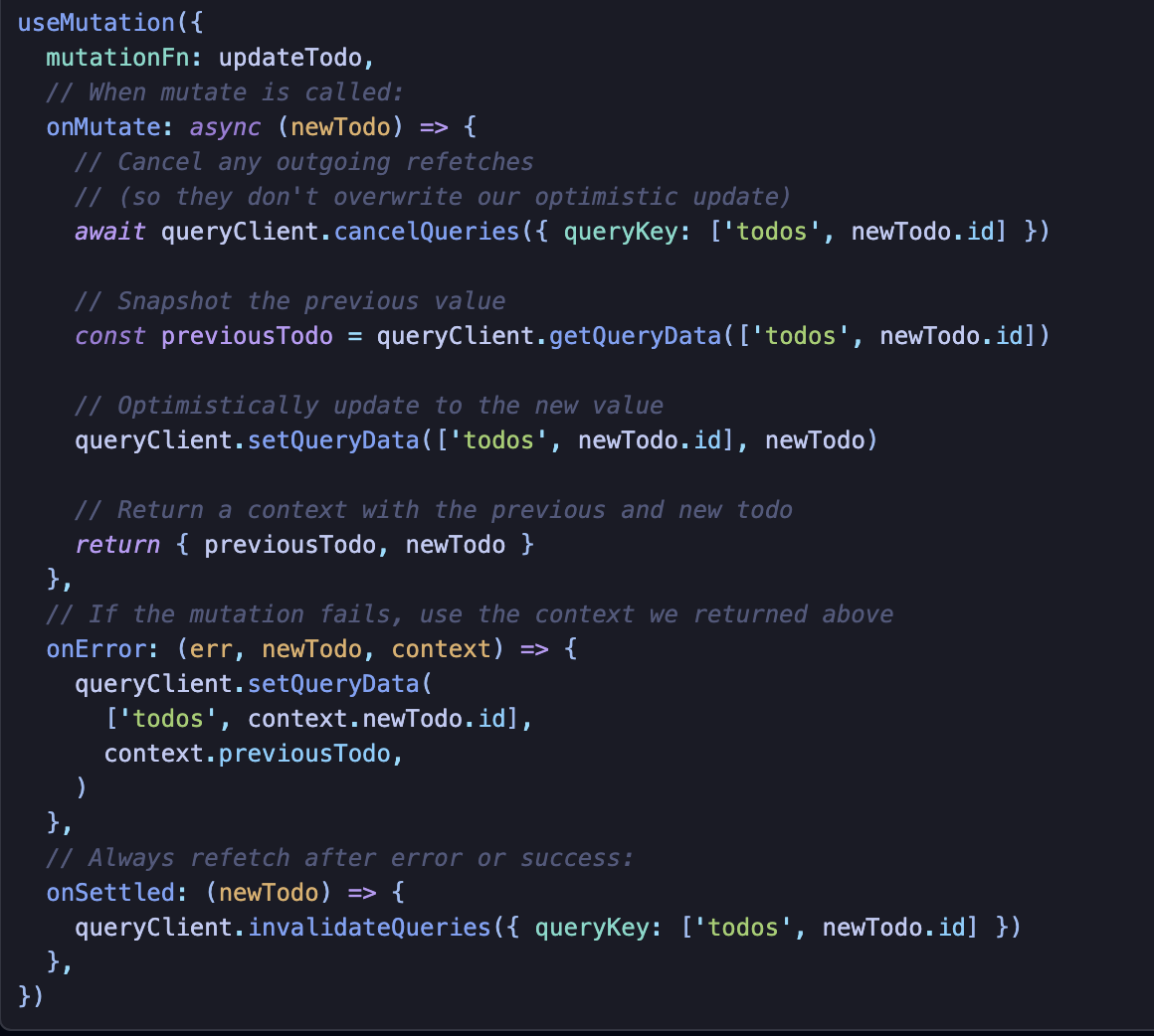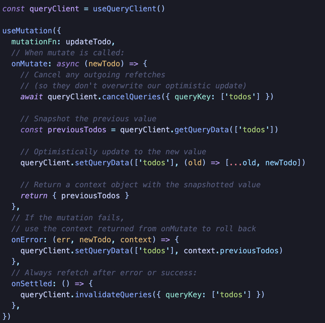 Cache 접근 방식은 onMutate/onSuccess/onError/onSettled와 같은 콜백을 이용하는 것이다.