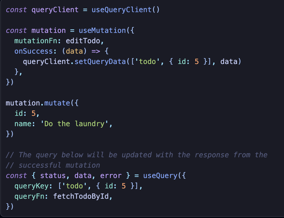 mutation 이후 서버로부터 받은 데이터를 가지고 쿼리 캐시를 업데이트 하는 것이다.