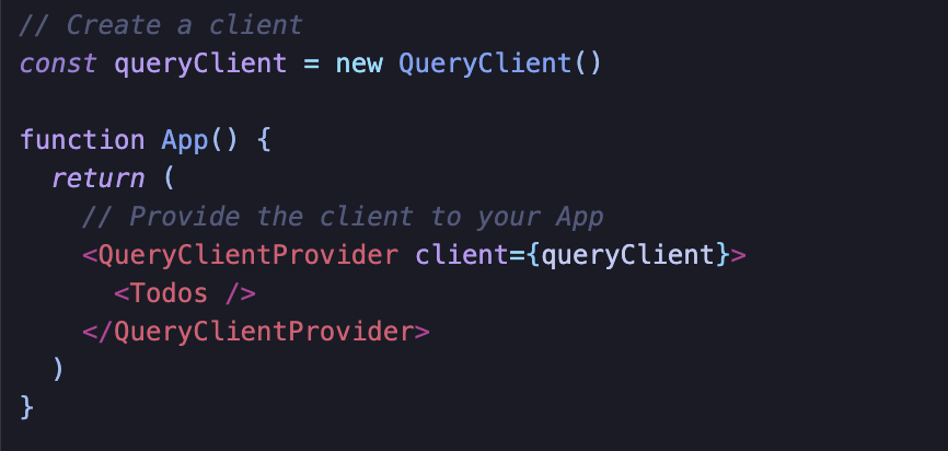 QueryClient는 Query Cache를 포함하고 관리한다. JS의 Map 자료구조로 구현되어 있으며 절대 변경되지 않는 정적 객체이다. Query Client를 생성해서 주입할 때 Next.js에서는 다르게 처리해야하는 부분이 있는데 이는 이후 다른 아티클에서 다루기로 한다.