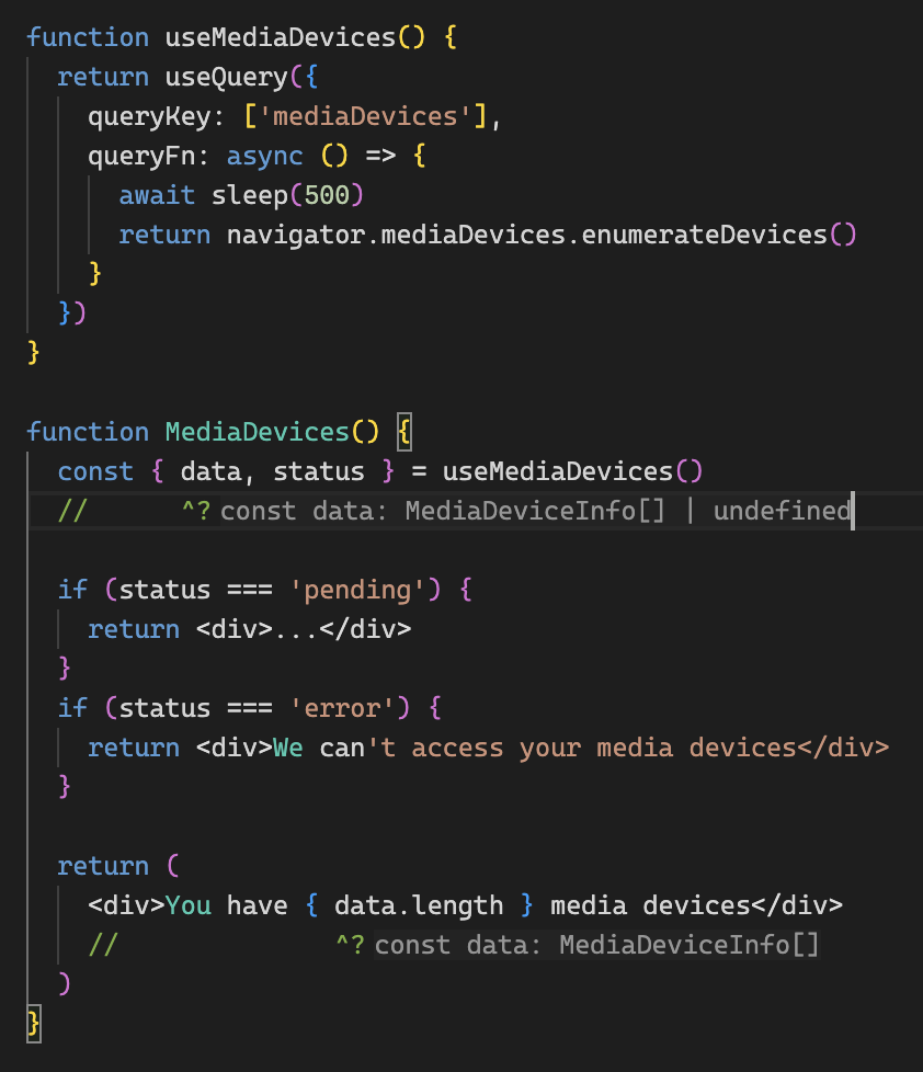 useQuery 라는 훅의 return 값으로 data 타입을 보면 undefined가 뜨는 것을 볼 수 있다.