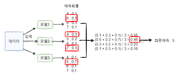 여러 개의 머신러닝 모델의 예측 확률을 평균내어, 가장 확률이 높은 클래스를 최종 예측 결과로 선정함. 각 모델의 확신도를 고려하므로, 하트보팅에 비해 더 세밀하고 정확한 결정을 내릴 수 있게 함.