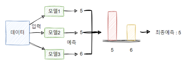 얻은 예측값들을 투표하여 가장 많은 표를 얻은 클래스를 최종 예측 결과로 선정함. 각 모델은 동일한 데이터셋에 대해 독립적으로 학습하고 예측을 수행함.