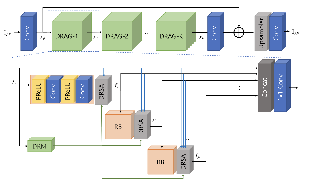 위의 문제들을 해결하기 위해 본 논문에서는 Residual Connection을 사용하여 HR 이미지를 재구성하는 Dynamic Residual Self-Attention Network(DRSAN)을 제안하게 되었습니다. 이는 복잡한 고정된 Network 구조 설계가 아닌 입력 이미지의 특징에 따라 동적으로 Residual Connection을 제어하도록 설계하였습니다. 이를 통해 Buliding block 사이의 Residual Connection을 동적으로 자동화 설계를 통한 경량화를 수행합니다.