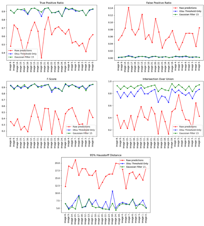- Green line: Gaussian fliter + OSTU threshold 모두 적용한 경우로 가우시안 필터를 함께 활용하여 객체의 경계 분할에 효과적으로 기여하였음을 확인할 수 있습니다.