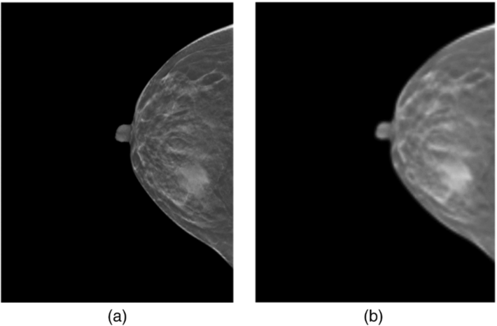 DBT Slice의 이미지 특성 상 해상도가 매우 높지만 Mass region이 해상도에 비해서 매우 작은 특징이 있습니다. 이러한 특징을 가지고 있는 DBT Slice 이미지를 그저 단순하게 Resizing 하게 되는 경우, 해상도 감소로 이어지는 원인이 됩니다. 좌측 이미지의 경우 원본 이미지에 해당하며 우측 이미지는 좌측 이미지에 대해서 단순한 Resizing을 활용한 결과입니다. 실제로도 해상도 측면에서 많은 Loss가 발생함을 확인할 수 있습니다.