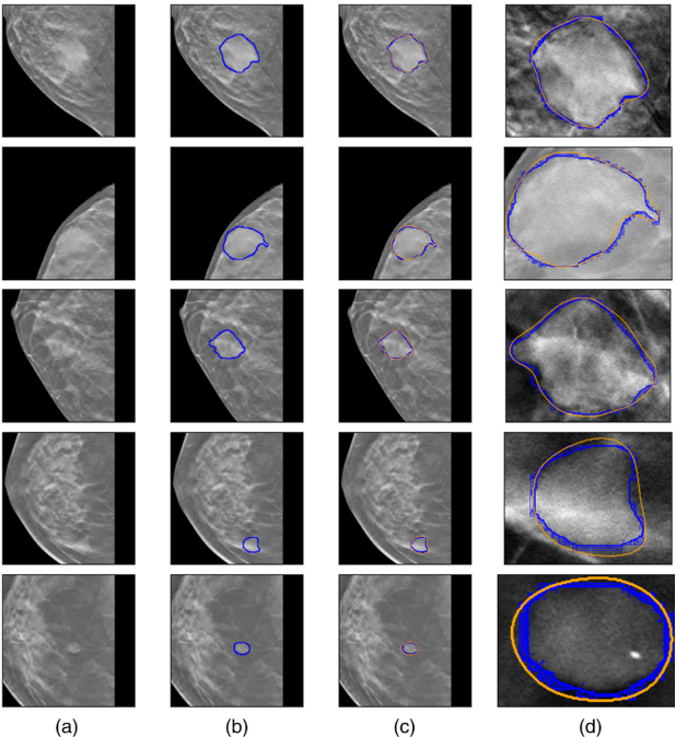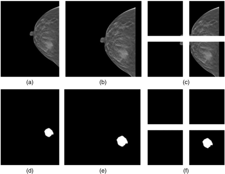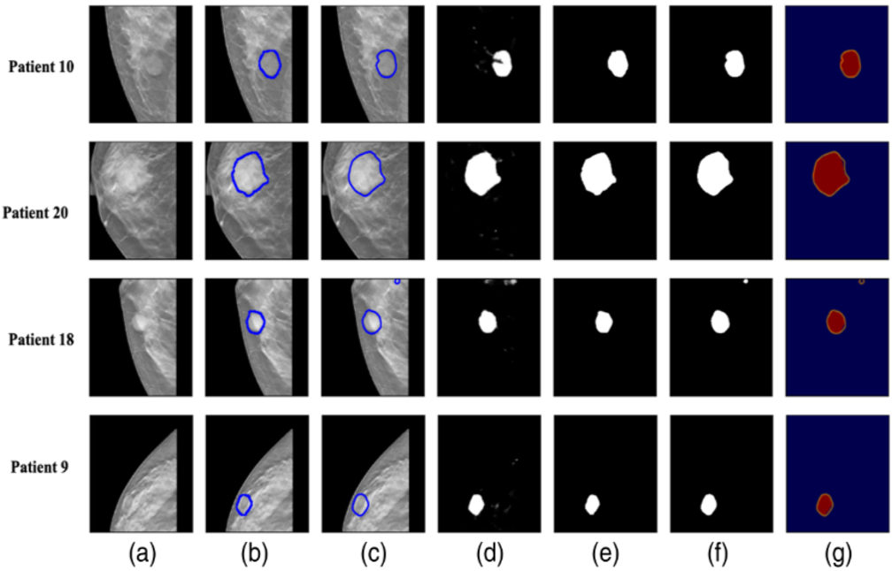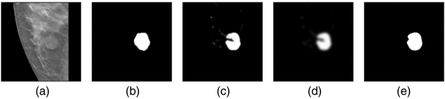 먼저, Gaussian filter를 적용하게 됩니다. 해당 필터링을 통해서 노이즈를 효과적으로 줄이면서 객체 경계 보존에 기여할 수 있다고 이야기하고 있습니다. 다음으로는 OTSU thresholding 과정을 수행합니다. 해당 과정은 가우시안 필터를 적용한 다음 남아있는 노이즈 제거 및 배경과 객체 분할에 기여하여 낮은 대비 속에서 해당 프레임워크의 ROI 영역인 즉, Mass region에 대해서 배경과 뚜렷한 분할을 수행할 수 있게 합니다. 위 사진을 보시게 되시면 (a)의 경우 원본 이미지를 의미하고 있으며 (b)의 경우 해당 하는 Mask 이미지라고 보시면 되겠습니다. 이후 (c)의 경우, 전처리 과정만 적용했을 때를 의미하고 있으며 전처리만 적용하였을 때 낮은 대비로 인해서 mask 이미지에서 손실이 발생함을 확인할 수 있습니다. 이후 (d)의 경우엔 가우시안 필터만 적용했을 때며 마지막 (e)가 가우시안 필터와 오츠 알고리즘을 모두 적용했을 때의 결과입니다. 위에 사진을 통해서 알 수 있듯이 실제 GT와 유사한 Mask를 생성한 것을 확인 할 수 있습니다.