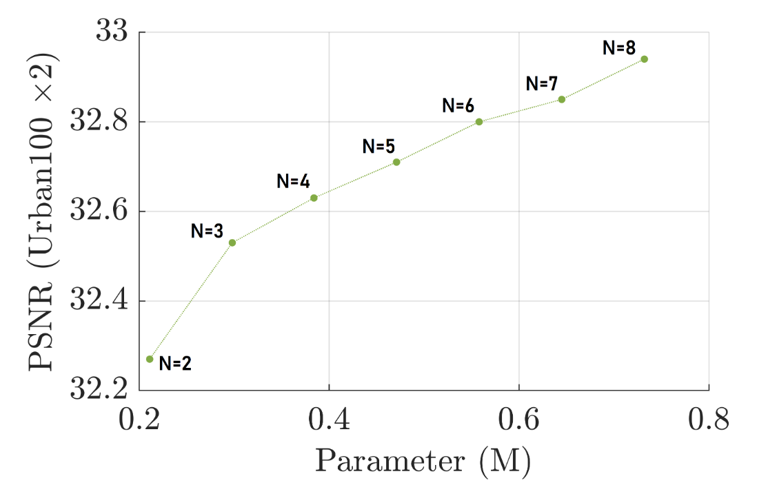 IDB의 개수(N)가 증가할수록 모델의 파라미터 수도 증가하며, 이에 따라 PSNR 값(성능)도 점진적으로 향상되는 것을 볼 수 있습니다. 이는 네트워크가 더 깊어질수록 더 많은 특징을 학습하고 장거리 의존성을 더 잘 포착할 수 있기 때문입니다. 그러나 N=3 지점 이후부터는 파라미터 수가 계속 증가함에도 불구하고 PSNR 값의 증가폭이 점차 줄어드는 경향을 보입니다. 특히 N=6, N=7, N=8로 갈수록 파라미터 수는 상당히 늘어나지만 성능 향상은 미미합니다. 즉, N=3 지점 이후부터는 파라미터 수가 계속 증가함에도 불구하고 PSNR 값의 증가폭이 점차 줄어드는 경향을 보입니다. 특히 N=6, N=7, N=8로 갈수록 파라미터 수는 상당히 늘어나지만 성능 향상은 미미합니다. 즉, N=3 이후부터는 성능 개선 대비 파라미터 증가의 효율이 감소하여 경량화 목표에 부합하지 않기 때문입니다.