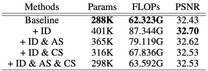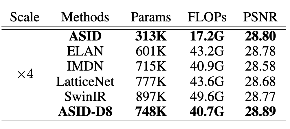 해당 결과는 4배(×4) 업스케일링 조건에서 다양한 경량 이미지 초해상도(Super-Resolution, SR) 방법들의 성능과 효율성을 비교한 것으로 비교된 모델 중 가장 적은 파라미터 수와 가장 낮은 연산량을 보이며 그럼에도 불구하고 PSNR은 28.80으로, ELAN(28.78)이나 SwinIR(28.77)과 거의 동등하거나 오히려 약간 더 높은 성능을 달성했습니다. 이는 ASID가 매우 효율적이면서도 경쟁력 있는 이미지 재구성 품질을 제공함을 의미합니다.