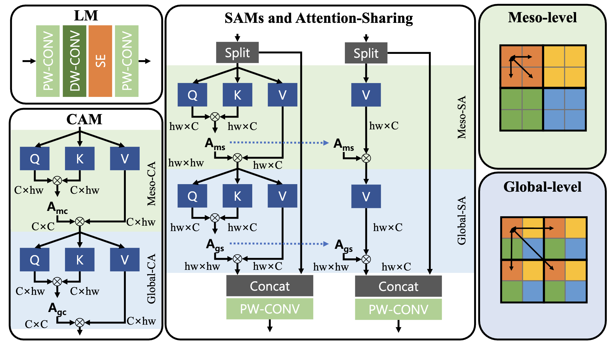 위의 Attention Module에서 가장 중요한 점은 Attention-Sharing, Channel Split을 활용한다는 점입니다.Transformer based SR Model의 경우, 비효율적이지만 Self-Attention layer를 쌓아 올리는 데 있어서 필수적인 기법입니다.
