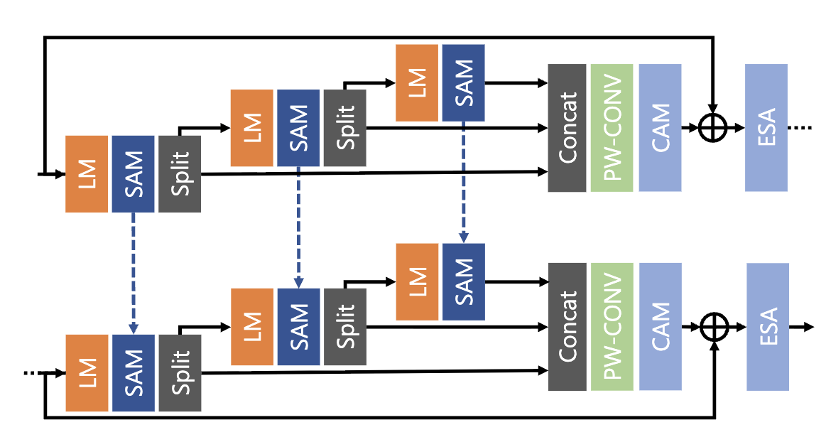 IDB는 크게 Local Module(LM), Spatial Attention Module(SAM), Channel Attention Module(CAM)로 구성되어져 있습니다. 이러한 설계는 특정 채널이 다른 채널보다 중요한 feature를 전달하는 것에서 착안되었으며 필수 Feature를 보존하고 나머지 feature를 후속 모듈로 넘기는 방식입니다.