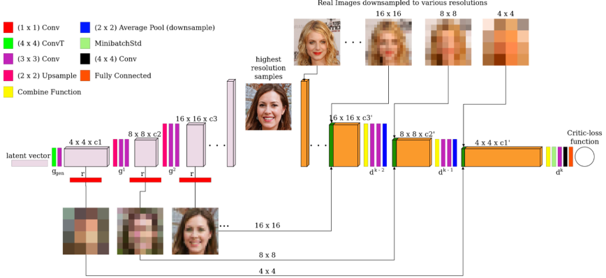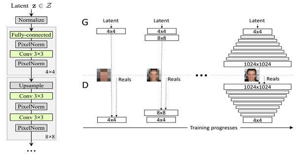 ProGAN의 경우, 처음에는 저해상도 이미지를 생성한 다음 훈련 전반에 걸쳐 레이어를 점진적으로 확장하며 고해상도 이미지 생성을 수행합니다.
