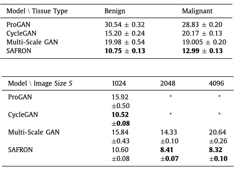 해당 실험에서는 Multi-scale GAN과 비교하였으며 해당 모델의 경우 고해상도에서 조직의 형태학적 세부 정보 손실이 발생했음을 원본 이미지와 비교했을 때 확인할 수 있습니다. 그러나 해당 논문에서 제안하고 있는 SAFRON의 경우, 실제 이미지와 비교했을 때 훨씬 더 현실적으로 보이기도 하며 조직의 형태학적 세부 정보까지 높은 수준으로 생성하고 있음을 확인할 수 있었습니다.