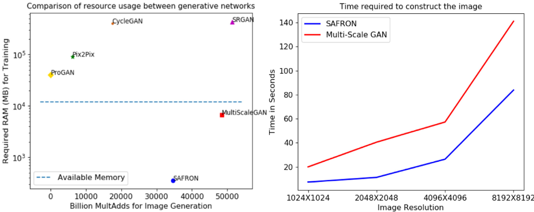 SAFON이 다른 모델들 보다 적은 연산량과 적은 RAM 요구량을 보였으며 이미지 생성 소요 시간 또한 고해상도에서도 매우 빠른 속도로 수행됨을 확인 할 수 있었습니다.