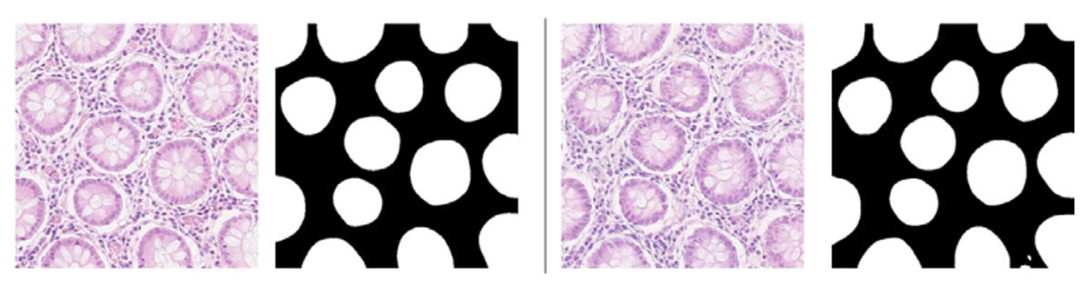 왼쪽 사진이 GT이며 오른쪽 사진이 본 논문에서 제안하는 모델이 생성한 이미지와 해당 이미지의 THeCoT 모델을 적용하여 Gland mask를 구한 것입니다. 이처럼 FID가 가장 낮은 점수를 기록했기에 실제 이미지와 비교했을 때, 매우 유사함을 확인할 수 있습니다.