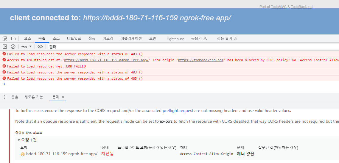 todobackend가 내 ngrok서버 쪽에 요청하는게 아닌 내 ngrok서버가 todobackend에 요청하고 있었기에 배포하는 서버인 todobackend의 CORS 설정이 허용되어있어야 했다