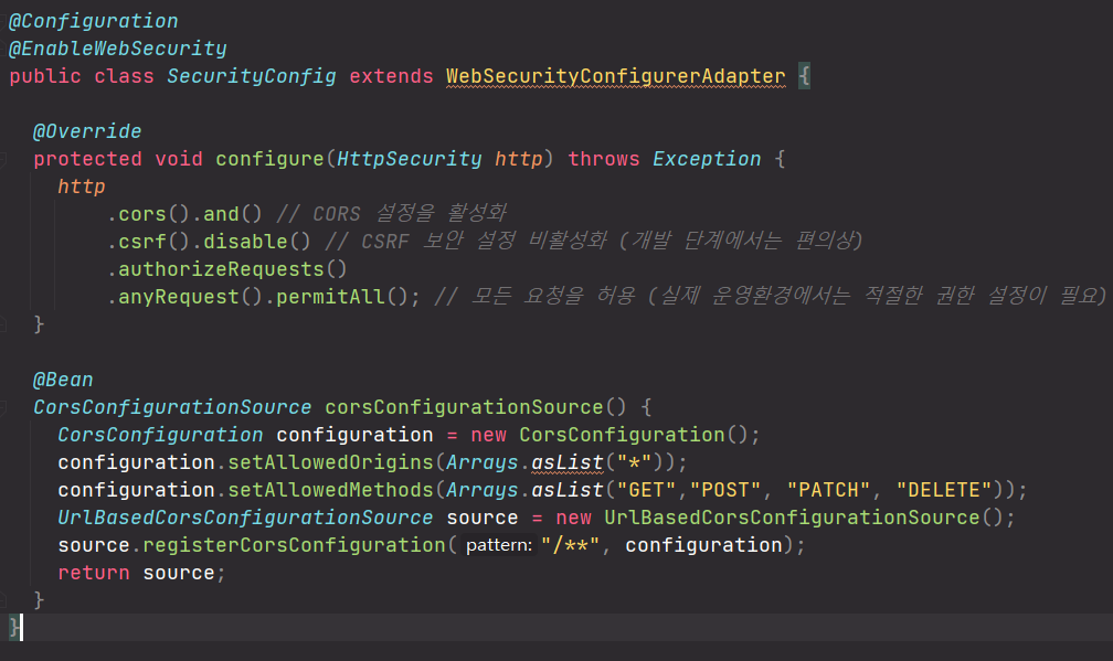 @CrossOrigin사용만으론 부족한가? 라는 의문이 들어서 시큐리티를 사용해 cors허용과 함께 csrf를 비활성화 했다.