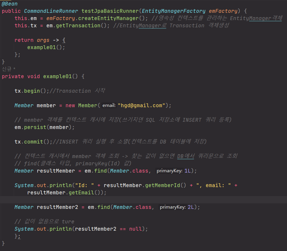 tx.begin() 트랜잭션 시작em.persist() 컨텍스트 객체 , 쿼리문 저장tx.commit() 쿼리 실행, 객체 DB저장em.find() 컨텍스트 선 검색, 없으면 쿼리로 DB검색저장 :