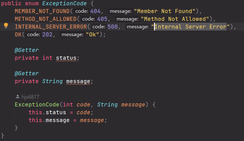 ExceptionCode은 열거형으로 status와 message 값을 가지고 있으며
