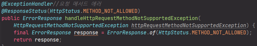 최종적으로 ResponseEntity가 아닌 ErrorResponse.of를 통해 처리된 ErrorResponse 자체를 리턴해야 했기에 @ResponseStatus(HttpStatus.METHOD_NOT_ALLOWED) 애너테이션을 설정하였다