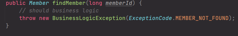 RuntimeException 계승하는 BusinessLogicException는 서비스계층에서 throw되고 있다