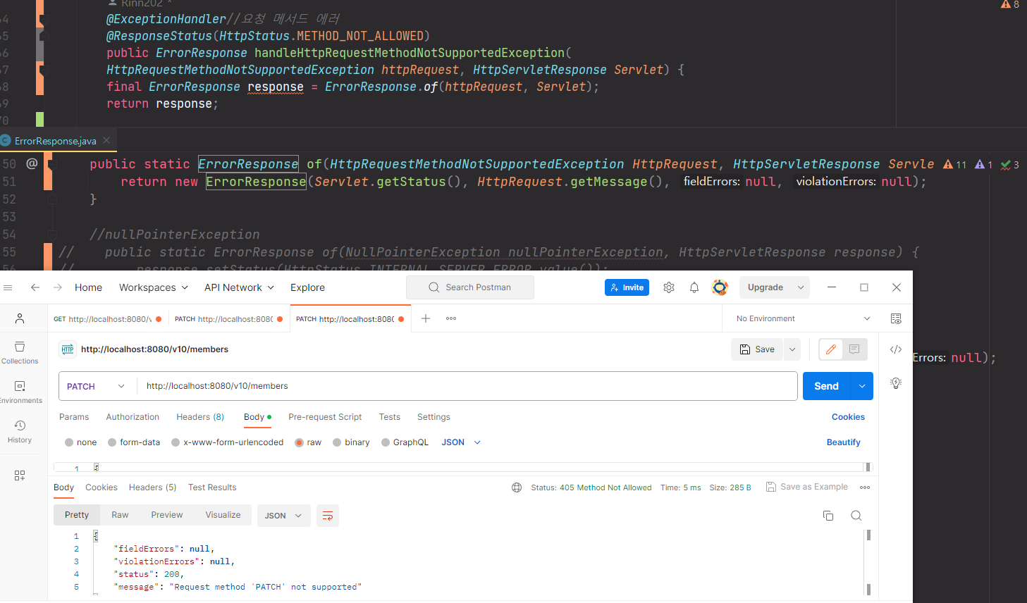 `"Request method 'PATCH' not supported"`는 상태 코드 설명값이다
