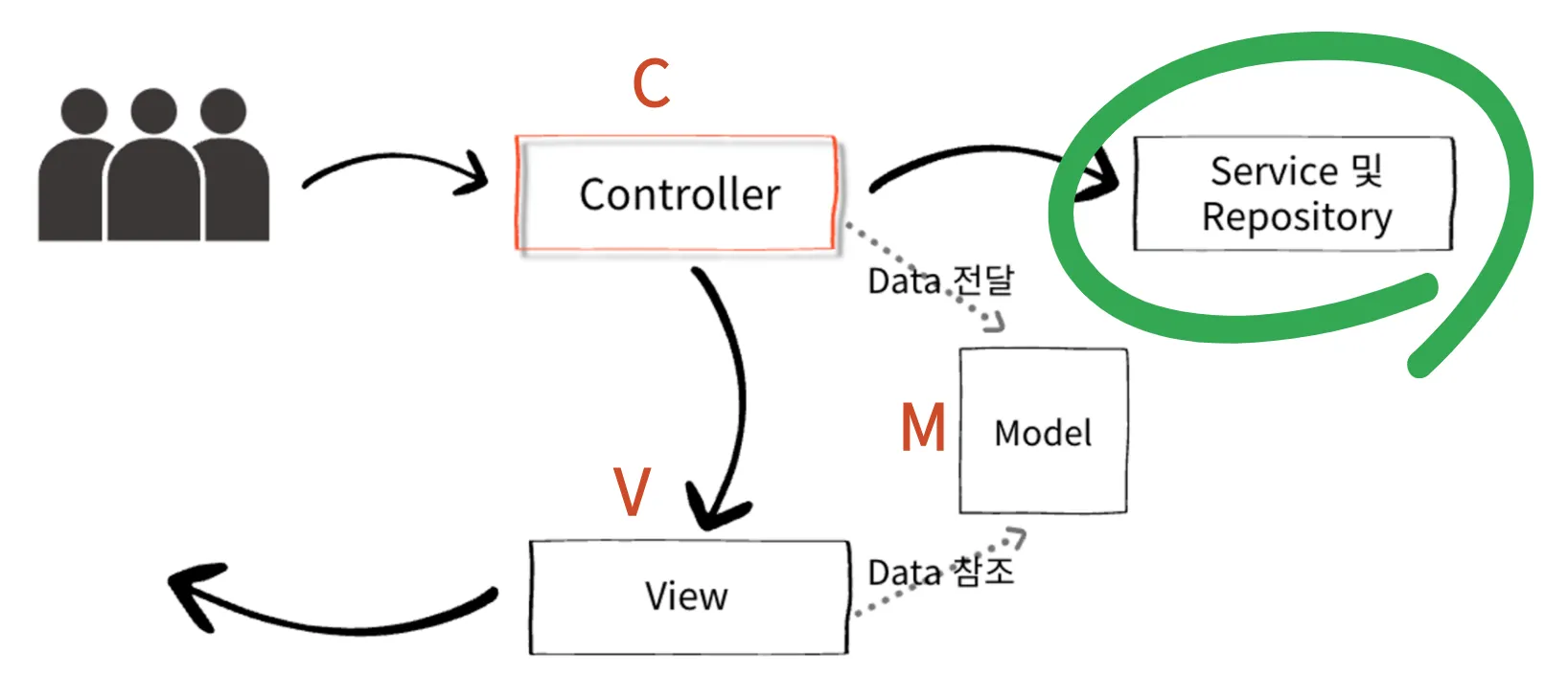 - Controller에서 요청에 대한 모든 처리를 수행한다. 즉, 책임이 너무 많다.