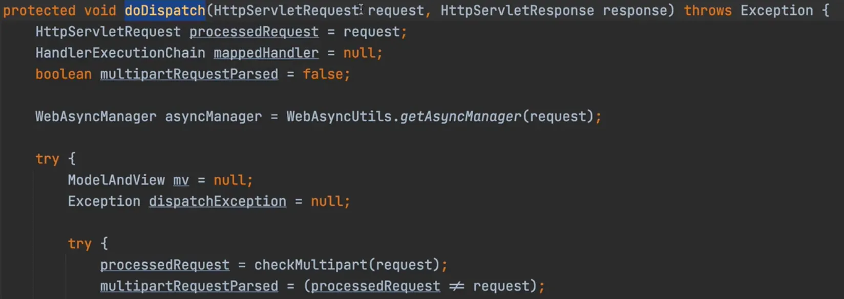 service()가 호출된다.FrameworkServlet.service()를 시작으로 여러 메서드가 호출됨과 동시에 가장 중요한DispatcherServlet.doDispatch()가 호출된다.