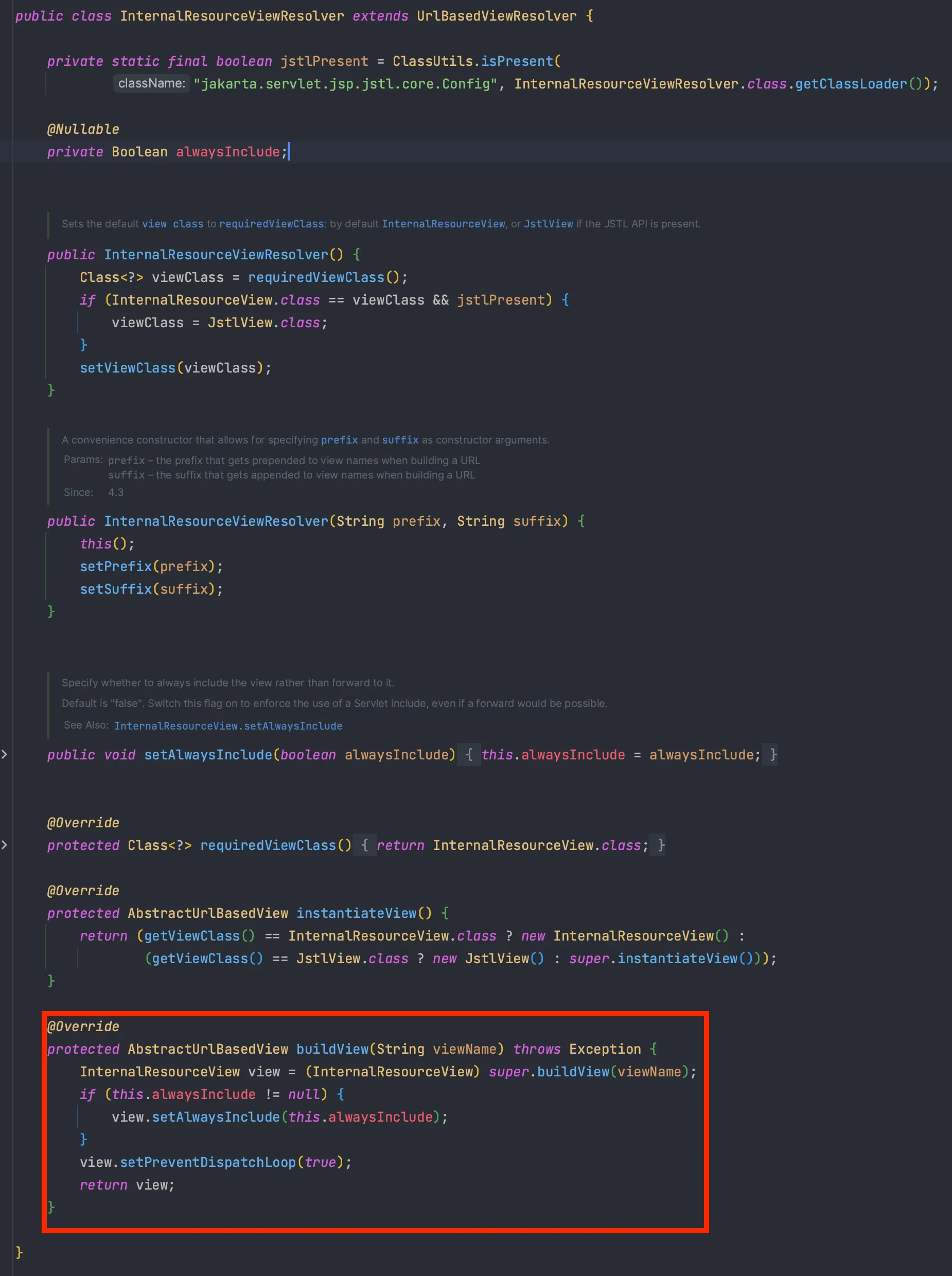 “test” 논리 View Name 얻음”test” 이라는 View Name으로 viewResolver를 우선순위 대로 호출InternalResourceViewResolver.buildView(String viewName)