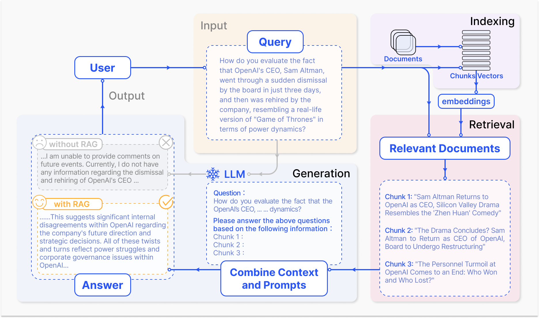 의미가 있는 유사성 계산을 통해 외부 지식 기반에서 관련 Document chunk를 검색하여 LLM을 향상 시킬 수 있다.