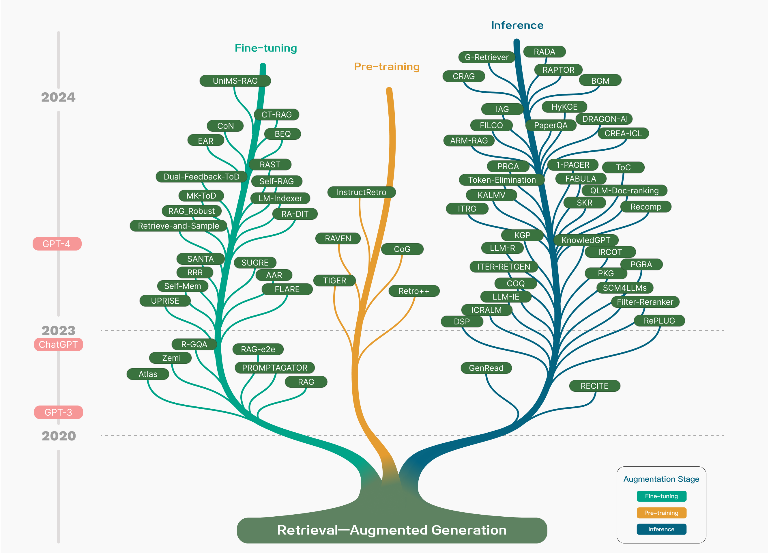 본 눈문에서는 RAG가 처음 제안되기 시작되었을 때부터 시작하여 Fine-tuning, Pre-training, Inference의 3가지 기술트리로 분류하였다.