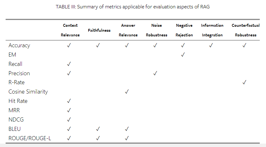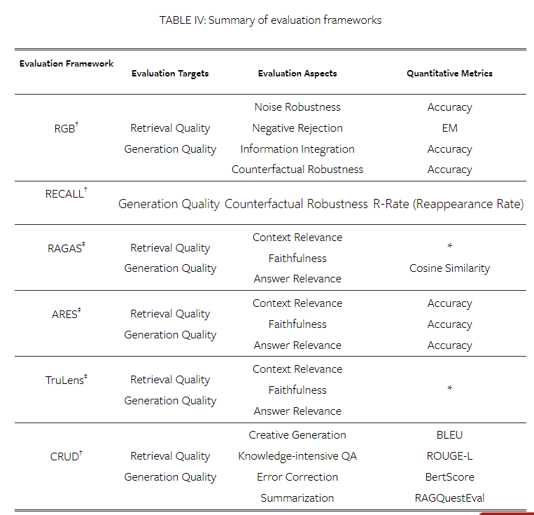 RGB, RECALL 및 CRUD[167, 168, 169]와 같은 저명한 벤치마크는 RAG 모델의 필수 능력을 평가하는 데 중점을 둡니다. 동시에 RAGAS[164], ARES[165] 및 TruLens8과 같은 최첨단 자동화 도구는 LLM을 사용하여 품질 점수를 판단합니다. 이러한 도구와 벤치마크는 표 IV에 요약된 바와 같이 RAG 모델의 체계적인 평가를 위한 강력한 프레임워크를 집합적으로 형성합니다.