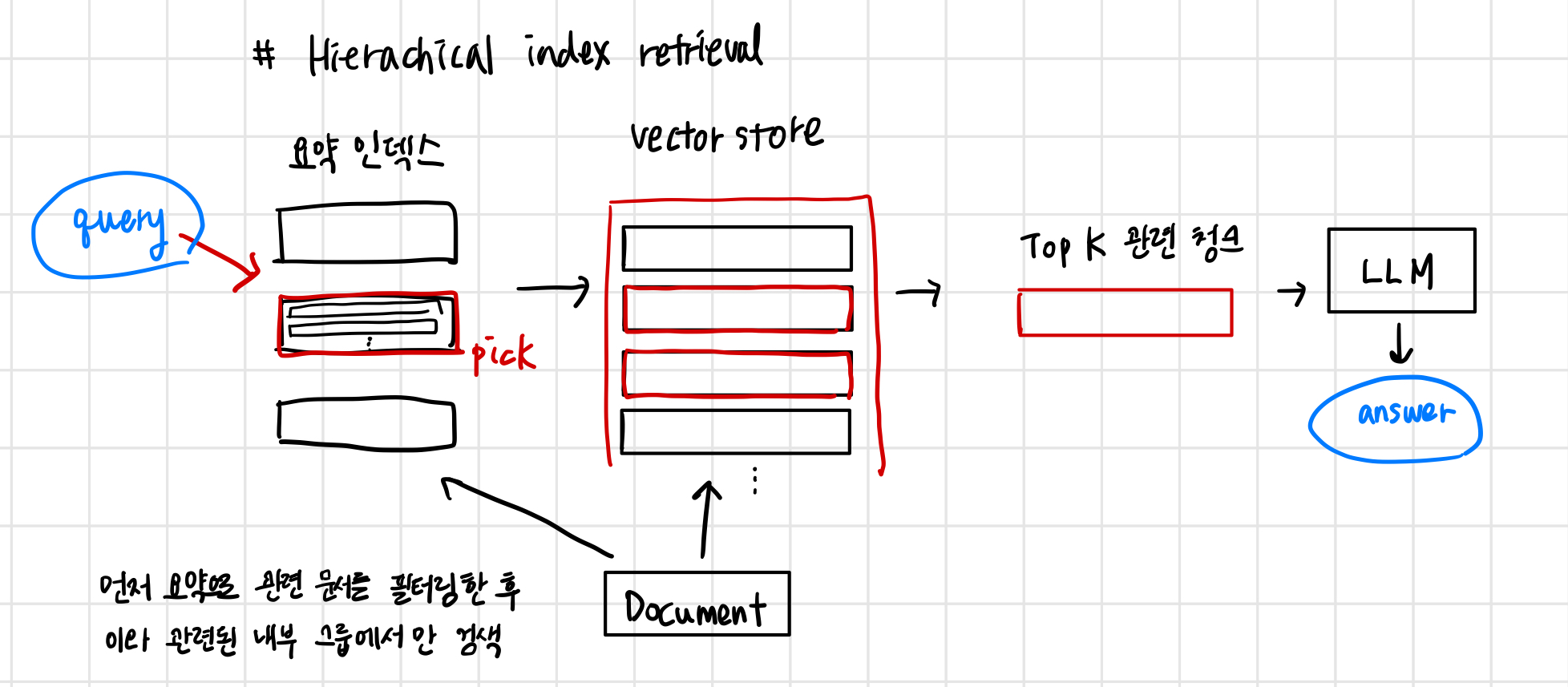 대규모 데이터베이스의 경우 이를 수행하는 효율적인 방법은 요약으로 구성된 인덱스와 문서 청크로 구성된 인덱스 두개를 만들고 두단계로 검색하는 것. 먼저 요약으로 관련 문서를 필터링한 다음 이 관련 그룹 내부에서만 검색한다.