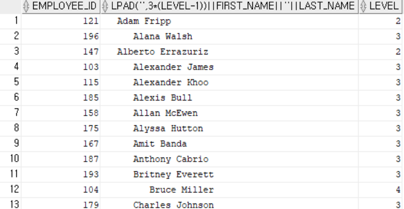 select employee_id,lpad(' ',3*(level-1))|| first_name ||' '||last_name,level