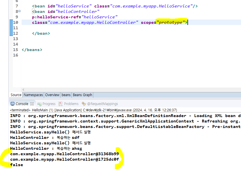 이를 bean 태그의 scope 속성을 사용해서 바꿀 수 있다.