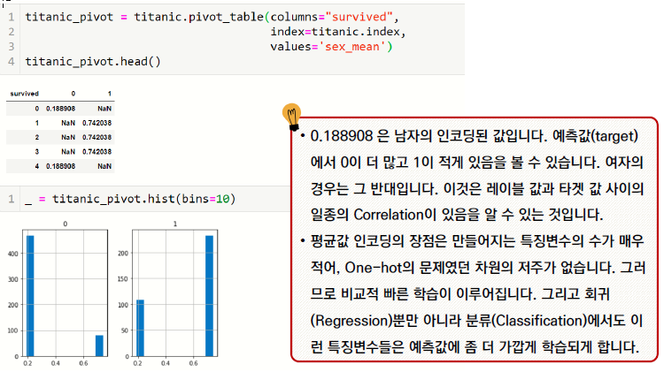 평균값 인코딩의 단점은 구현과 검증이 조금 까다롭고 과적합(Overfitting)의 문제가 있다는 것이다.