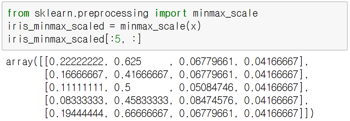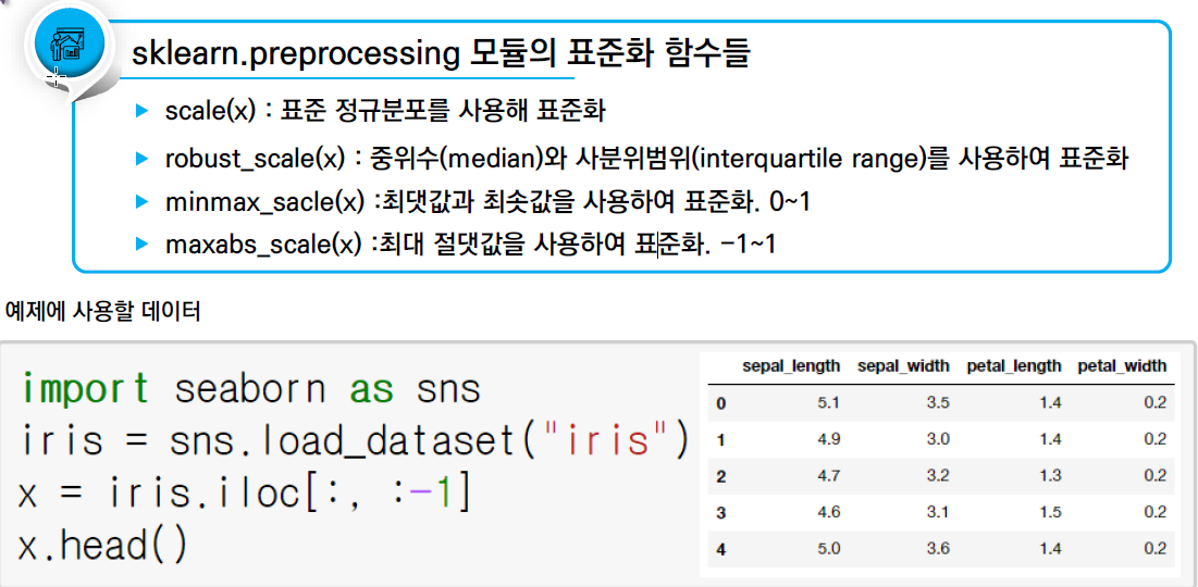 표준화 방법은 scale(), minmax_scale(), maxabs_scale() 함수와 같음