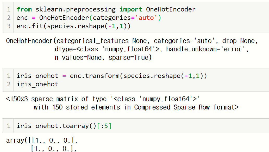 원-핫 인코딩은 preprocessing 모듈의 OneHotEncoder 클래스를 이용