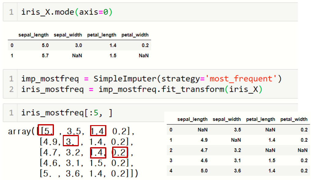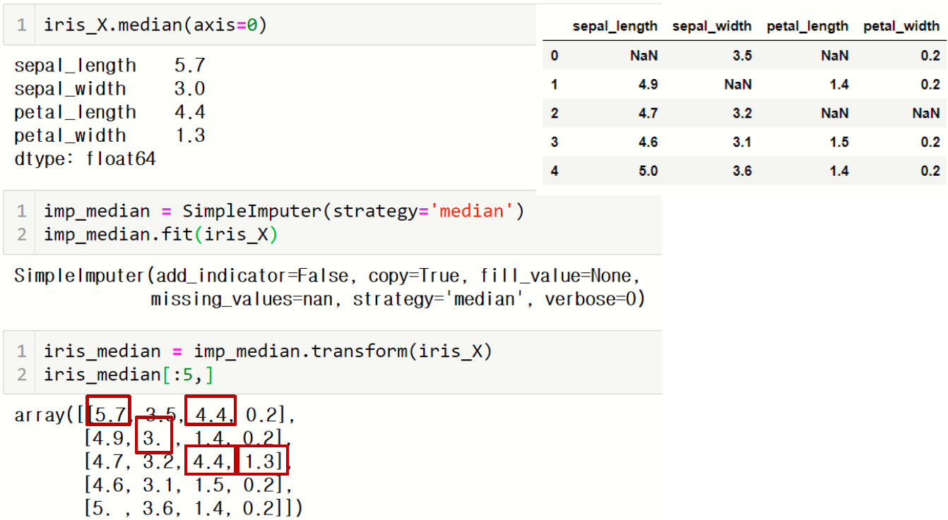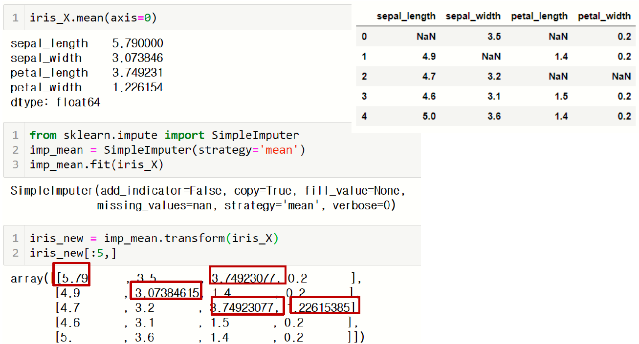 판다스의 데이터프레임을 다루는데 익숙하다면 fillna(), apply() 등의 함수를 이용해서 결측치 처리하는 것이 더 편할 수 있다.
