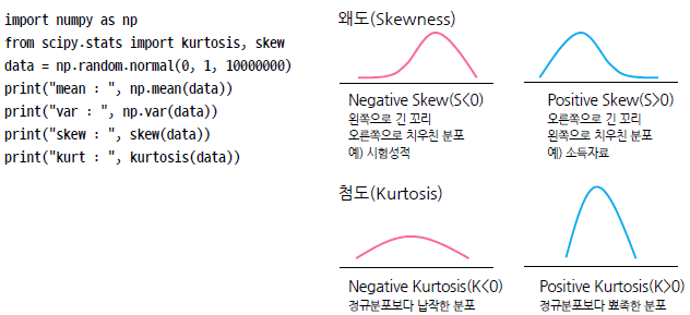 첨도 : 음수. 낮은 봉우리, 0. 정규분포와 같은 봉우리 높이, 양수. 높은 봉우리