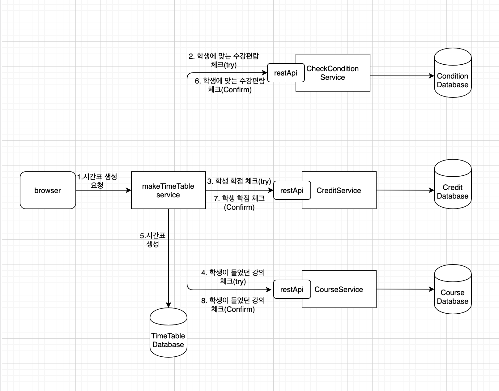 이때, 각 서비스 호출에 대해 실패할 경우, 롤백하지 않으면 일관성이 깨지고 만다. 즉, 시간표 생성 요청에 대해 트랜잭션 처리가 보장되어야 한다.