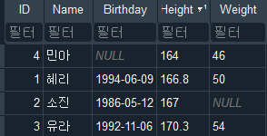 null이 아닌 조건 : SELECT *From Person Where Name NOT NULL