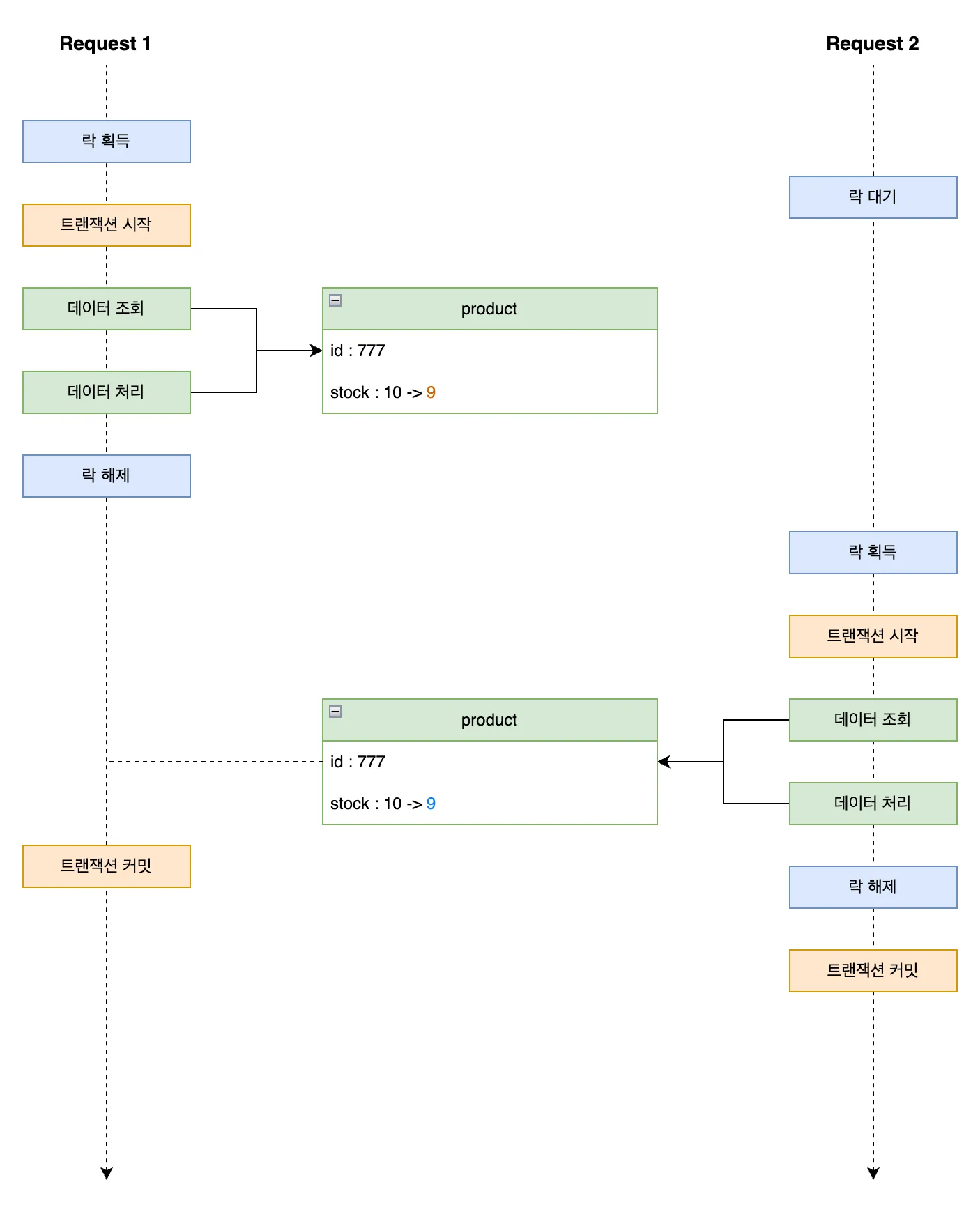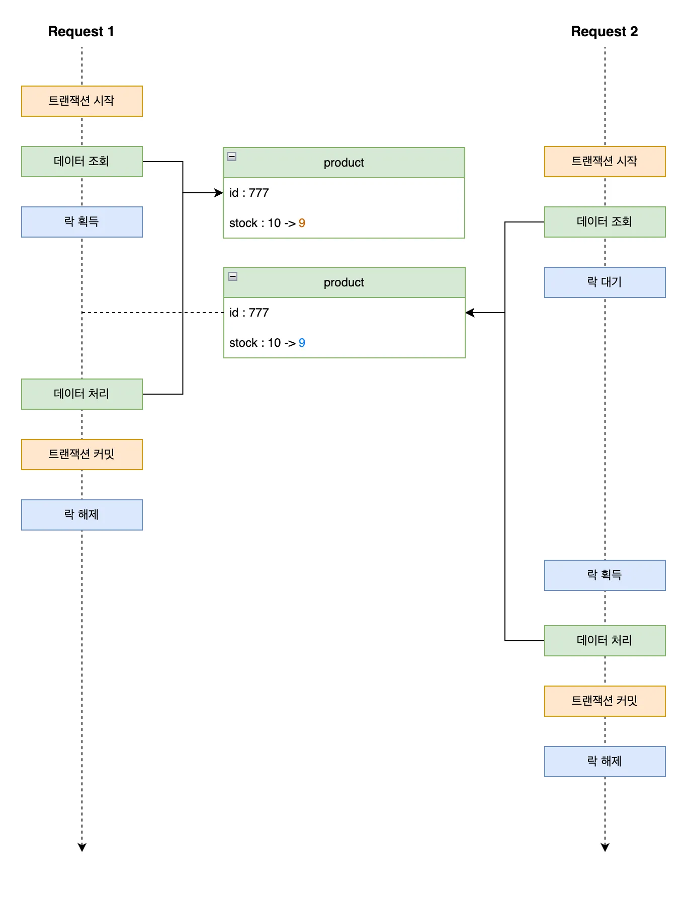 조회 시점에 락이 적용되지 않아 동일한 재고 수를 여러 요청이 동시에 읽는 문제가 발생할 수 있다.