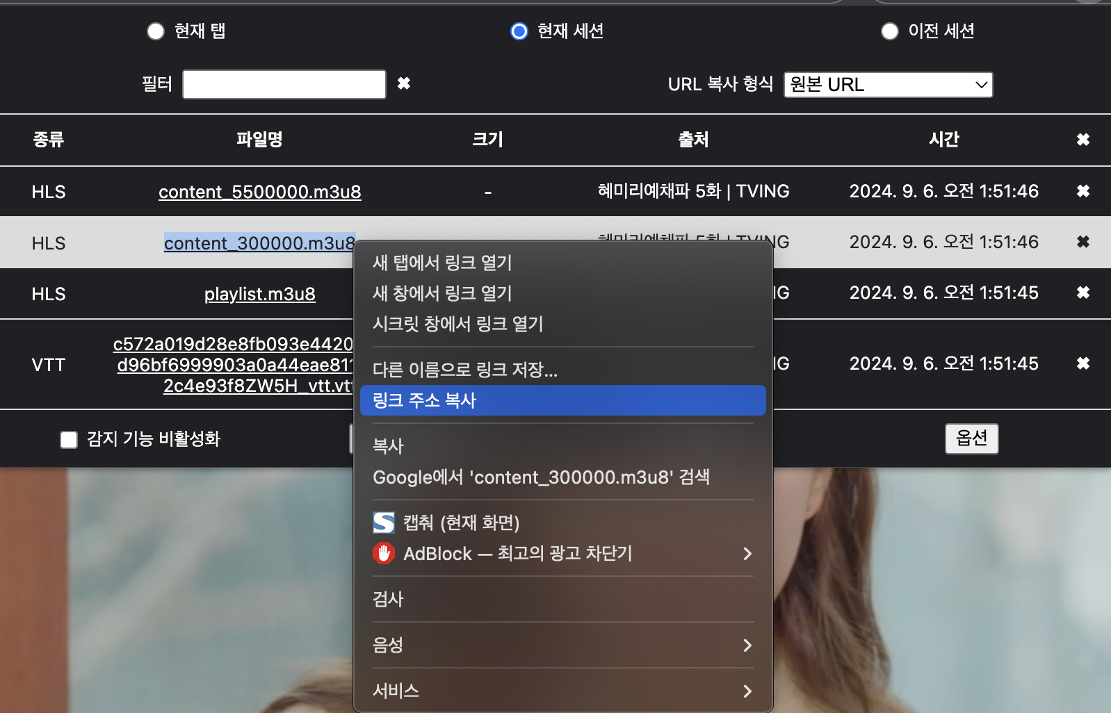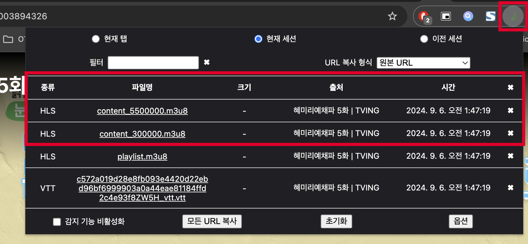 알아서 m3u8 링크를 찾아줍니당. 안 뜨면 페이지내에서 새로고침